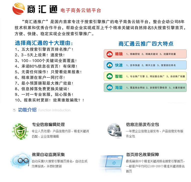 4、首頁排名:客戶的產(chǎn)品信息能快速出現(xiàn)在各大搜索引擎首頁,被潛在客戶瀏覽,在家坐等訂單! 精準(zhǔn)搜索:精準(zhǔn)關(guān)鍵詞帶來精準(zhǔn)流量,搜索精準(zhǔn)關(guān)鍵詞的客戶基本上都是有購(gòu)買意向的客戶,流量即銷量。