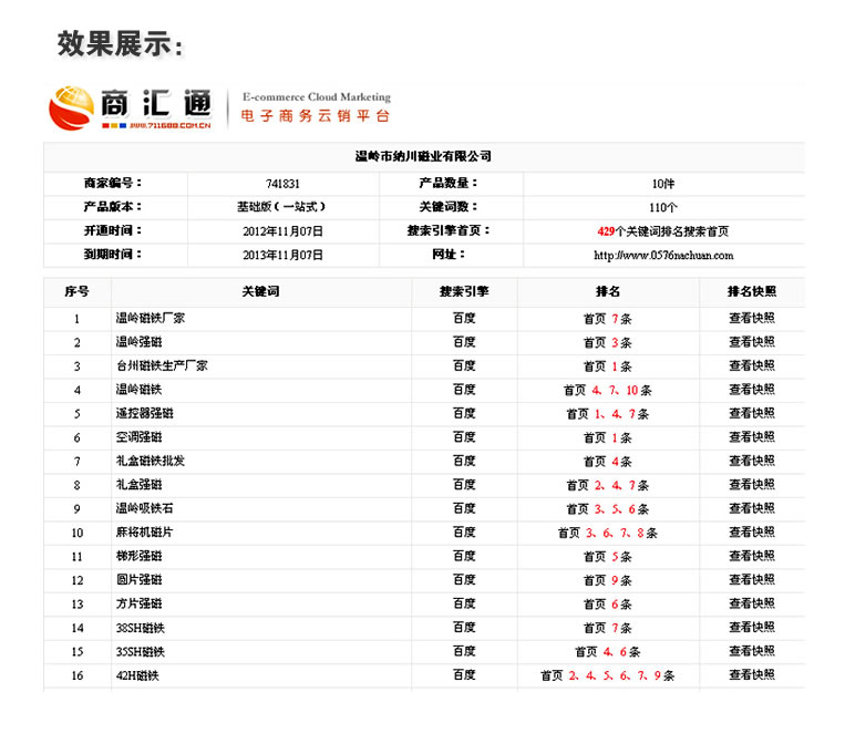 答:商匯通-開始推廣后,3到5天即可看到首頁排名效果。一般來說,全年可以達(dá)到上百到上千的關(guān)鍵詞量做到首頁排名效果。