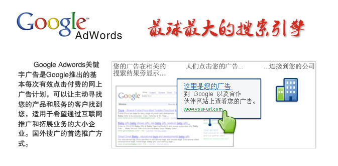 現(xiàn)在,您可以面向在 Google 上進行搜索的用戶投放廣告了。即使您提供的服務或產(chǎn)品已出現(xiàn)在 Google 搜索結果中,AdWords 仍可以幫助您在 Google 及 Google 廣告聯(lián)網(wǎng)中吸引新的受眾。